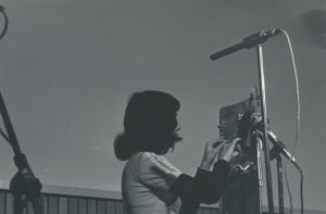 1. Katalin Ladik performing on the tablophone at the Stedelijk Museum, Amsterdam, 1977. Photo: Guy Schraenen. Credits: The artists and acb gallery